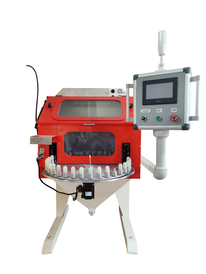 - 产品转至喷砂工位后,产品开始自转,喷头可设定上下升降行程,对产品均匀喷砂;